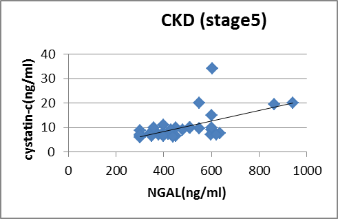 Fig. 6: Correlation between serum NGAL, and cystatin-c (r = 0.56, p<0.01) in CKD patients (stage5)