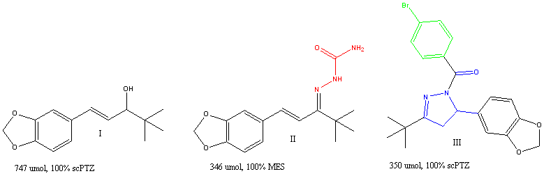 Following the ligand-based design, our group has developed a series of derivatives from stiripentol (I) (an orphan antiepileptic drug with unique activity against severe myoclonic epilepsy in infants (SMEI)/or Dravet’s syndrome [7]). Compounds II and III were the most active congeners showing potent activity in MES and scPTZ screens, respectively. At 350 μmol, compound III was 2.13 times more active than stiripentol in scPTZ test, while compound II displayed 100% protection against MES screen at the same dose level, which was unachievable by lead compound (stiripentol I), even at 747 μmol [8].