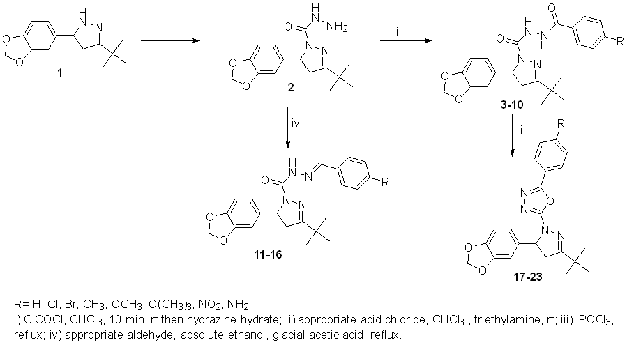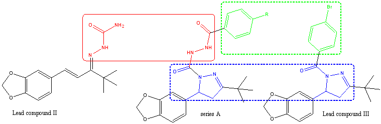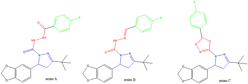 Converting the amide group in series A to imine moiety in series B, 5-(benzo[d][1,3]dioxol-5-yl)-N'-arylidene-3-tert-butyl-4,5-dihydro-1H-pyrazole-1-carbohydrazide derivatives (11-16), is satisfactory as well, since it produces typical semicarbazone structure and permits studying the effect of H-bond donors/acceptors on the activity.