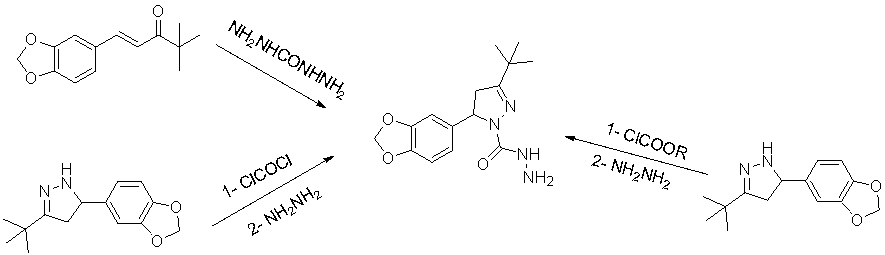 Initially, 3,5-disubstituted 2-pyrazoline (compound 1) has been prepared as previously reported [8]. Then, the free base 1 has been converted, while fresh, to the main carbohydrazide derivative 2. Indeed, compound 2 could be obtained from 1via diverse chemical pathways like hydrazinolysis of the carbamoyl ester of compound 1, resulting from the reaction of 1 with alkyl chloroformates. Moreover, the reaction of 1 with phosgene, followed by addition of hydrazine to the produced carbamoyl chloride will afford compound 2 in two-step one-pot reaction instead of two isolated reactions in the former method. In addition, the reaction of the carbazide with stiripentol starting chalcone (1-(benzo[d][1,3]dioxol-5-yl)-4,4-dimethylpent-1-en-3-one) will provide compound 2,however,it is not preferred due to the possibility of dimerization (scheme 2).