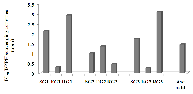 EG3 (ethanolicextract of elephant ginger rhizomes) had the lowest IC50 of DPPH scavenging activity (0.26 ppm), while ascorbic acid standard gave IC50 of DPPH scavenging capacity 1.45 ppm.All of extracts (n-hexane, ethyl acetate and ethanol) of three kinds ginger (small ginger, elephant ginger and red ginger) had the IC50 in the range of 0.26-3.1 ppm. Based on the classified of antioxidant potency by Blois [11], it could be classified as very strong antioxidant.In the present study ethanolic extract of small ginger (SG3), elephant ginger (EG3) and red ginger rhizomes (RG3) had IC50 of DPPH scavenging capacities was 1.74, 0.26 and 3.1 ppm respectively, while in the previous study [18] showed that IC50 of DPPH scavenging capacity of ethanolic extract of ginger rhizomes was 0.64 ppm.
