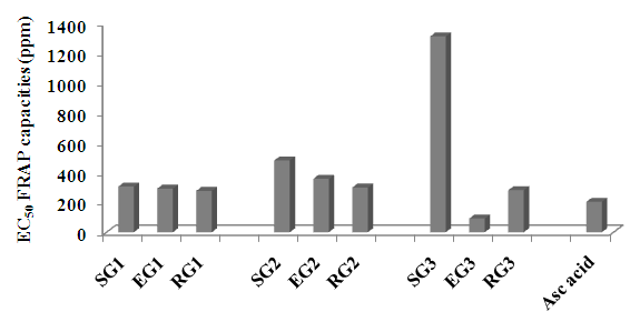 Different polarities extracts from three kinds gingerhad FRAP capacities ranged from 92 to 1313 ppm. EG3 (ethanolic extract of elephant ginger rhizomes) had the lowest EC50 ofFRAPcapacity 92 ppm,while ascorbic acid standard gave EC50 of FRAP capacity 203 ppm and its exposed thatantioxidant capacity of EG3 was two times of potency of ascorbic acid using FRAPmethod.