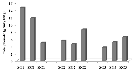 The total phenolic content among the different polarities extracts were expressed in term of gallic acid equivalent using the standard curve equation y = 0.0044 x + 0.031, R2 = 0.993. The total phenolic content in different polarities rhizomes extracts from three kinds ginger showed different result ranged from 3.64 to 14.56 g GAE/100 g. SG1rhizomes extract (n-hexane rhizomes extract of small ginger) had the highest phenolic content (14.56 g GAE/100g) (Fig 3).