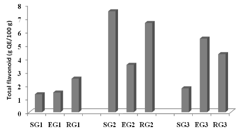 The total flavonoid content among the different polarities extracts were expressed in term of quercetin equivalent using the standard curve equation y = 0.00761355x + 0.00491857, R2= 0.998. The total flavonoid content indifferent polaritiesrhizomes extracts from three kinds gingershowed different result in the range of 1.33–7.50 g QE/100 g (Fig 4). SG2 (ethyl acetate extract of small ginger rhizomes) had the highest total flavonoid content (7.50 g QE/100 g) and the lowest (1.33 g QE/100 g) for SG1rhizomes extract.