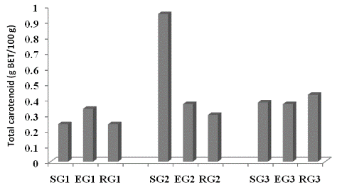 The total carotenoid content among the different polarities extracts were expressed in term of beta carotene equivalent using the standard curve equation y = 0.02764x - 0.00324857, R2 = 0.999. The total carotenoid content in different polarities rhizomes extracts from three kinds ginger showed different result in the range of 0.24 – 0.95 g BET/100 g (Fig 5). The highest carotenoid content (0.95 g BET/100 g) for SG2rhizomes extract, while the lowest carotenoid (0.24 g BET/100 g) for SG1 and RG1rhizomes extract.