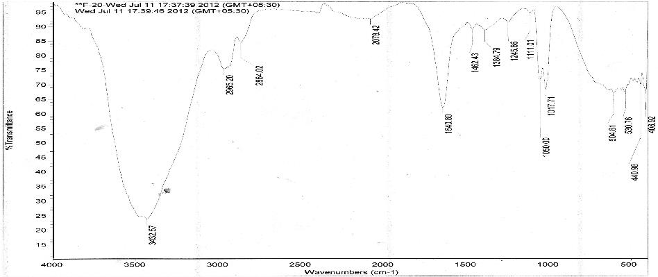 Results: The infra-red spectra showed specific absorption bands for flavanoids viz. 1245.86 to 1111.01 cm-1 for HCO stretch of ether; 1330 to 1050 cm-1 for CO stretch of lactone. In addition IR spectrum showed specific absorption bands for flavanoids viz. 3432.57cm-1 for OH stretch for alcohol and phenol. Mass spectra showed pseudomolecular ion (M+ion) peak at m/z 464 which corresponds to molecular formula C21H20O12.