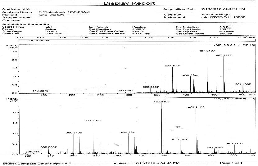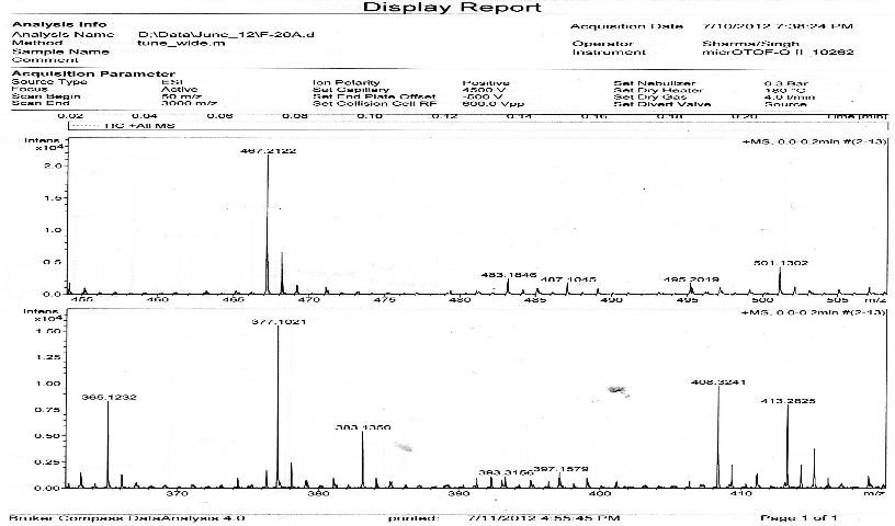 The isolated test compound was subjected to IR using KBr/chloroform for the study of absorption of infra-red radiation with its corresponding functional groups clearly [22]. The 1H-NMR & 13C-NMR were recorded at room temperature using Bruker Avance III 500 NMR spectrophotometer and the solvent used was DMSO. The chemical shifts were given in δ (ppm) value relative to TMS as internal standard. The mass spectral analysis was performed on micro TOF QII. Electrospray ionization was used as a source.