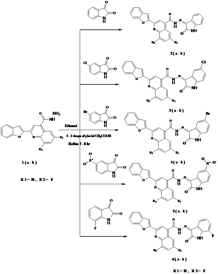 (1-benzofuran-2-yl)-N'-[(3Z)-2-oxo-1, 2-dihydro-3H-indol-3-ylidene] quinoline-4-carbohydrazide and its derivatives 2(a-b), 3(a-b), 4(a-b), 5(a-b) and 6(a-b) were obtained by 2-(1-benzofuran-2-yl) quinoline-4-carbohydrazide 1(a-b) 0.050 g (1.5 mmol) and substituted isatin (1.5 mmol) into the round bottom flask containing 10 ml of ethanol, then add catalytic amount of glacial acetic acid as presented in scheme-1.
