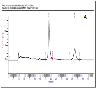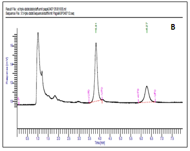 Fig. 3: HPLC chromatogram of Boswellic acid marker (A) versus extract of Boswellia serrata (B)
