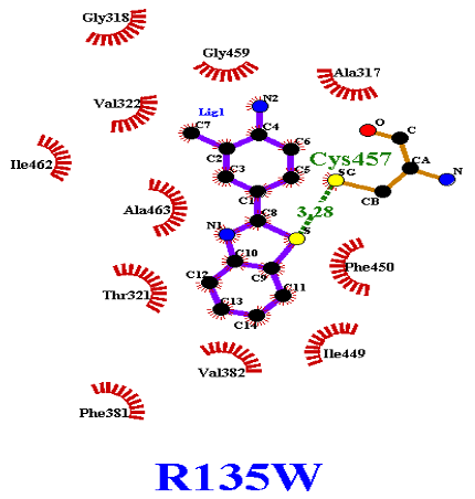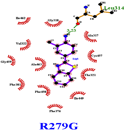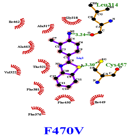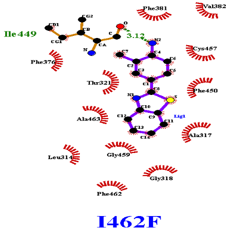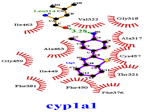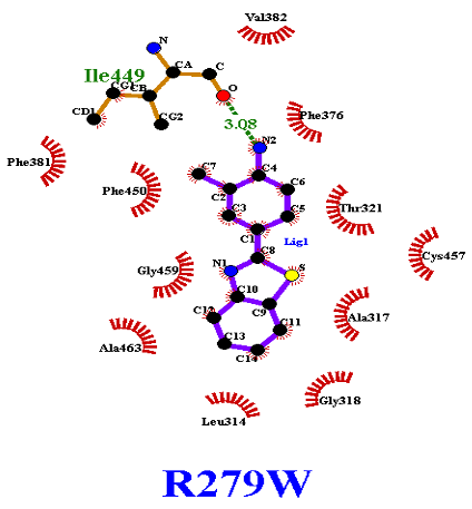 Based on in vitro studies the drug 2-(4-Amino-3-methylphenyl) benzothiazole (DF203, NSC 674495) active towards CYP1A1 protein and has the ability to lead the programmed cell death in cancerous cells. Substitution of deleterious amino acid in CYP1A1 protein may affect the binding ability of CYP1A1 with the drug molecules. This has to be analyzed to improve the potentiality of the drugs activity on CYP1A1 protein. Hence, we analyzed the binding ability of drugs with native and mutant models of CYP1A1 protein using Autodock4, and drug DF-203 and CYP1A1 interactions were depicted in LIGPLOT. The number of hydrogen bonds formed between protein and ligand were tabulated (Table 3).Van der Waals interacting energies and electrostatic interacting energies, binding energies, torsion free energy, internal energy between CYP1A1 protein (native and mutant) and DF-203 molecule were computed and tabulated (Table 2).