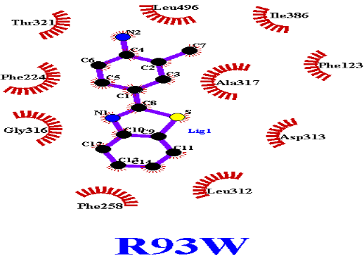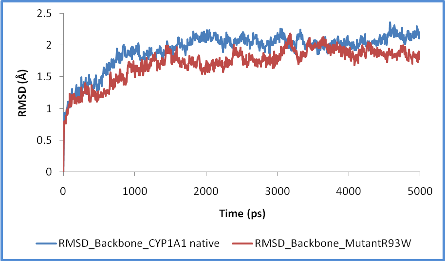 Molecular simulation dynamics approach was used to compute RMSF, RMSD and Rg values of the deleterious mutant model (R93W)and native CYP1A1 and the results provided a diverged fashion of variation between native and mutant model (R93W) of CYP1A1.Generally RMSD for all the Ca atoms were calculated from the starting structure which was described as the central origin to compute the protein system and RMSF were calculated to plot the degree of flexibility in mutant due to that mutation curve differ from native CYP1A1 during the simulation.