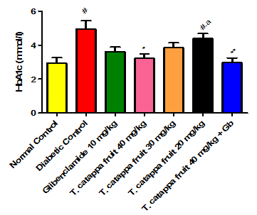 Fig. 1: Effect of different doses of Terminalia catappa fruit extract and glibenclamide on HbA1c (mmol/l) in diabetic rats at 12th week study period. (#p<0.05compared with Normal Control; *p<0.05, **p<0.01 compared with Diabetic Control; ap<0.05 compared with T. catappa fruit extract 40 mg/kg. Gb-Glibenclamide. Differences were analyzed by One-way ANOVA followed by Mann-whitney test)