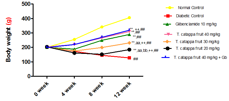 Fig. 2: Effect of different doses of Terminalia catappa fruit extract and glibenclamide on body weight (g) in diabetic rats. (##p<0.01 compared with Normal Control; **p<0.01 compared with Diabetic Control;++p<0.01 compared with glibenclamide treatment; aap<0.01 compared with T. catappa fruit extract 40 mg/kg; bbp<0.01 compared with T. catappa fruit extract 30 mg/kg. Gb-glibenclamide. Differences were analyzed by One-way ANOVA followed by Mann-whitney test)