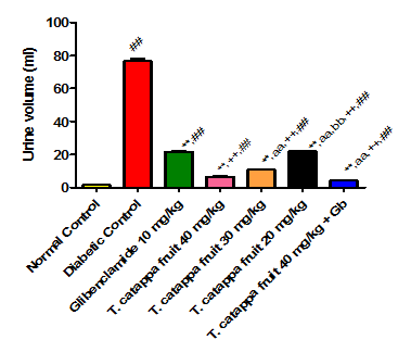 Fig. 3: Effect of different doses of Terminalia catappa fruit extract and glibenclamide on urine volume (ml) in diabetic rats. (##p<0.01compared with Normal Control; **p<0.01 compared with Diabetic Control; ++p<0.01 compared with Glibenclamide treatment; aap<0.01 compared with T. catappa fruit extract 40 mg/kg; bbp<0.01 compared with T. catappa fruit extract 30 mg/kg. Gb-Glibenclamide. Differences were analyzed by One-way ANOVA followed by Mann-whitney test)