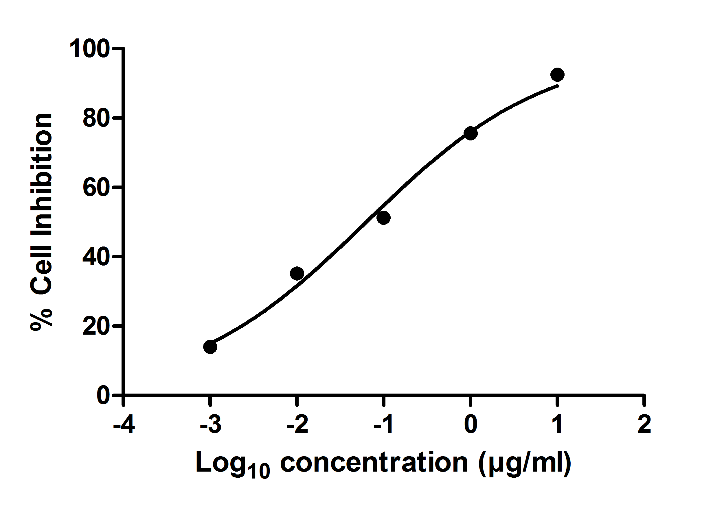 Nonlinear regression graph was plotted between % Cell inhibition and Log concentration and IC50 was determined using Graph Pad Prism software.