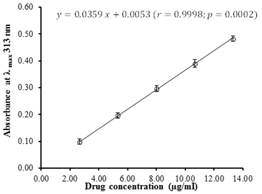Fig. 1: Calibration plot for determination of norfloxacin in a solution using UV method. Each data point is the average of 3 determinations with error bars indicating±standard deviation (SD)