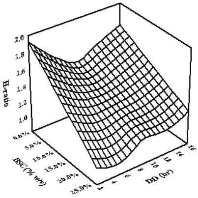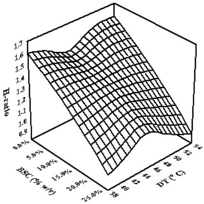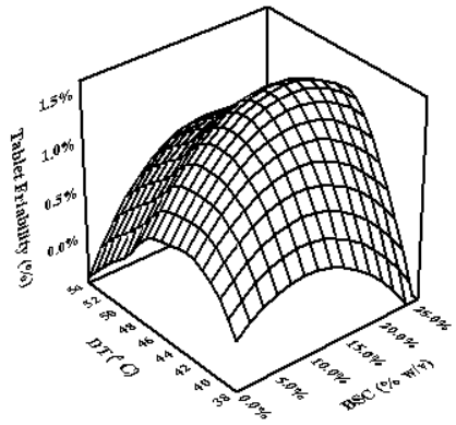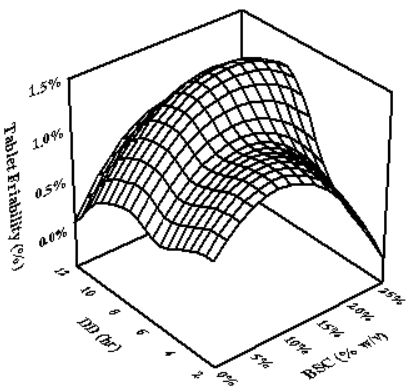 In other words, the pattern of the observed effects on tablet' friability exerted by either of BSC, DT or DD appear curvature in type rather than linear and, consequently, an increase in concentration of binder solution, drying temperature or drying duration are anticipated to be accompanied by an increase in tablet friability to a certain limit above which the influences become reversed where further increase in BSC, DT or DD would result in reduction of tablet friability, as can be shown in the surface plots for the combined influences of the three variables on tablet friability (fig. 5 a and b).