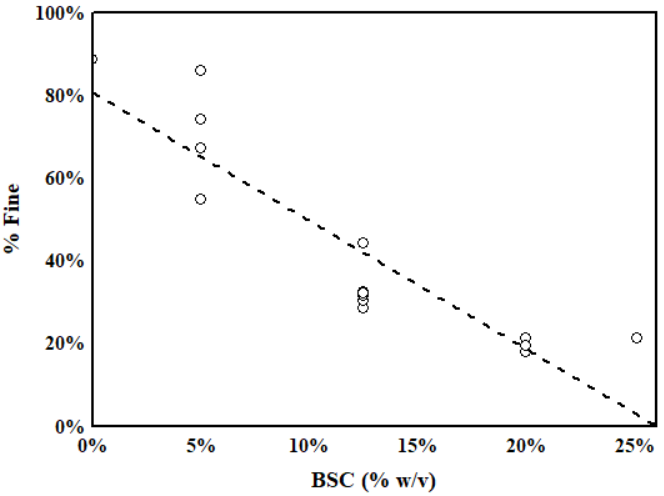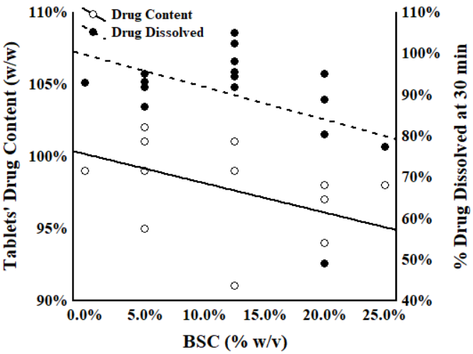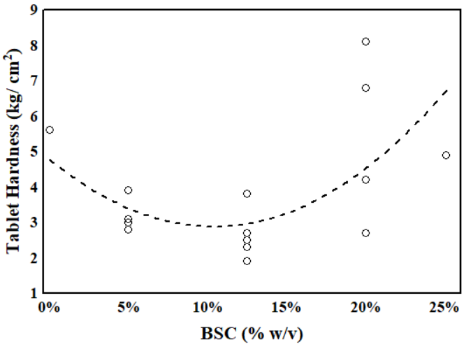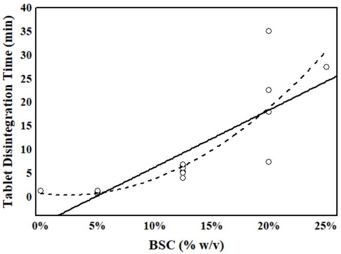 The prolongation in tablets' disintegration time that observed with increasing BSC is attributed to the increasing binding capacities of the granulating agents at higher concentration. Therefore, the amount of binder in a given formula will be a compromise between desired granule strength and desired disintegration time, as reported earlier [26].