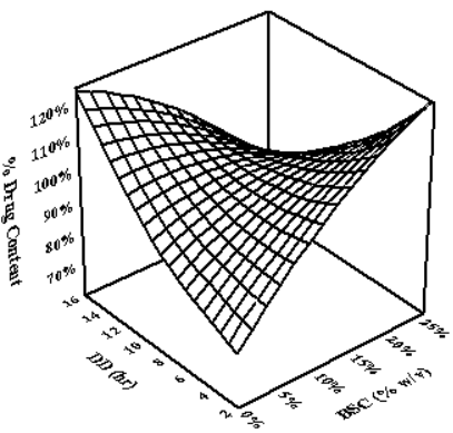 The displayed average tablets drug content for the sixteen formulation runs vary significantly in the range 88.5-101.8% (p = 0.011, table 5). None of the investigated variable measures a profound influence on tablets' drug content property at any variable setting (table 6).