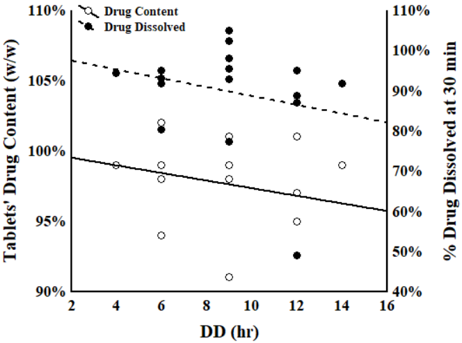 Based on known role of moisture content in tablet compressibility [23], the hygroscopic nature of the incorporated drug and excipients beside the effect of hemihydrates formation of Norfloxacin, it might be expected that DT and DD would measure profound influences on tablets' hardness. Yet, the result reveals minor and statistically insignificant influences of both variables on tablet hardness property at different setting (table 6) and, thus, encourages the ignorance of these influences, at least under the conditions of this study.