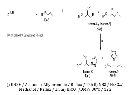 The chemicals/reagents used were purchased from sigma-aldrich chemicals (India) and Merck Chemicals (India). Reactions were monitored by pre-coated TLC (silica gel GF 254 [E.Merck]) plates. The IR spectra were recorded by using Perkin Elmer FTIR spectrometer using a thin film on KBr pellets and frequencies were expressed in cm-1. The 1HNMR spectra were recorded on Brucker 300 and 400MHz spectrometer using TMS as internal standard. The Chemical shifts values were reported in ppm and given in δ units. The Mass spectra were recorded by the EI process. The elemental analysis were performed on Perkin Elmer CHNS/O analyzer 2400. The synthetic route for 1, 2, 4-triazole derivatives of allyl aryl ethers was depicted in scheme 1.The substituted Phenols were used as starting materials. The reaction of substituted phenols with allyl bromide in the presence of K2CO3 and acetone yielded O-allyl ethers 1(a-f) in excellent yields [17-20]. The reaction of allyl aryl ethers 1(a-f) with N-Bromosuccinimide and a catalytic amount of H2SO4 in methanol at reflux temperature yielded a mixture of regioisomers (Markovnikov’s –anti Markovnikov’s products) [21-22]. Though Markovnikov’s rule predicts the major formation of isomer-A, the formation of isomer-B must be allowed due to the steric hindrance of Phenolic group. The separation of regioisomers was not achieved at this stage. The mixture of regioisomers were carried to further reaction with 1,2,4-triazole in presence of K2CO3 and DMF to afford 1-[3-(Aryloxy)-2-methoxypropyl]-1H-1,2,4-triazole and 1-(1-(Aryloxy)-3-methoxypropan-2-yl)-1H-1,2,4-triazole [23-25]. The positional isomers of 1,2,4-triazole derivatives were separated by NP-HPLC method using a gradient mixture of n-hexane and isopropanol as eluent.
