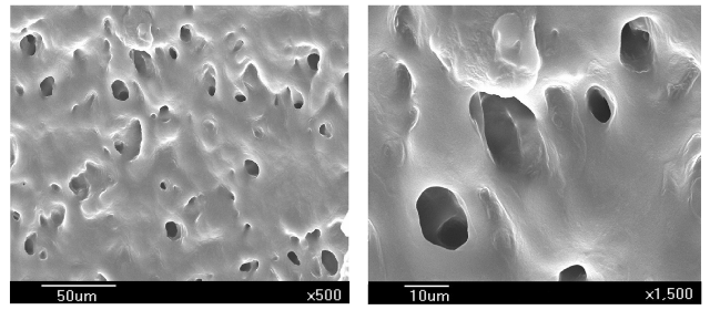Fig. 3: The surface appearances of Plai patch made from polymer blends between chitosan and hydroxypropylmethyl cellulose using glycerine as plasticizer at ×500 (left) and ×1,500 (right) under SEM study