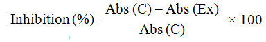 The inhibition assay was performed according to Miller [25] using DNS method. Aqueous and ethanol extract of seaweed concentration in 0.5 ml were added to 0.5 ml of 0.02 M sodium phosphate buffer (pH6.9 containing 6 mmol sodium chloride) containing 0.04 units of the α-amylase solution and were incubated at 37 °C for 10 min. After inhibition, 0.5 ml of 1% starch solution in 0.02 M sodium phosphate buffer (PH6.9) was added to each tube. The reaction was stopped with 1.0 ml of 3, 5 DNSA reagent. The test tubes were incubated in a boiling water bath for 5 min, then cooled down to room temperature. The reaction mixture was diluted by the addition of 10 ml distilled water and absorbance was then measured at 540 nm. The control samples were also prepared accordingly without any seaweed extracts and were compared with the test samples containing various concentrations of the seaweed extracts prepared with different solvents. The results were expressed as a percentage (%) inhibition calculated using the formula: