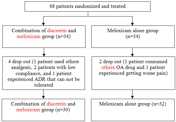 A total 68 subject were included in this study. Six subjects were excluded as they used others analgesics, had low compliance, experienced adverse drug reaction (ADR) that could not be tolerated, consumed other OA drug, and experienced getting worse pain. The remaining 62 patients completed the study and included in the analysis (fig. 2.)