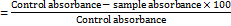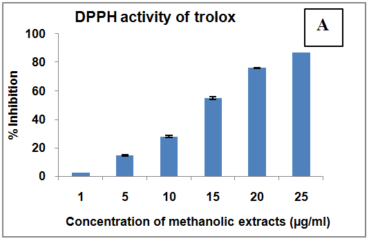 Required quantity of trolox was dissolved in methanol and stock solution of the sample was prepared by dissolving 10 mg of dried methanolic extract in 1 ml of methanol to give a concentration of 10 mg/ml. The 1.5 ml DPPH solution was added to 3 ml methanol and for control reading at the 517 nm absorbance was taken immediately. Different concentration of test sample was added and made 2 ml using methanol for dilution. Then 1.5 ml DPPH solution was added to each test tube. Using UV-visible spectrophotometer absorbance was taken at 517 nm after 15 min. Methanol was used as blank. The free radical scavenging activity (%) was measured using the following formula: