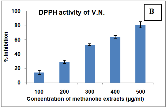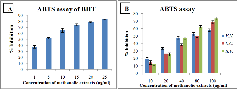 Fig. 2: (A) ABTS activity of standard BHT. (B) ABTS activity from methanolic extracts of the V. negundo (V. N.), L. camara (L. C.) and B. variegata (B. V.). Results are expressed as mean±SD of three replicates