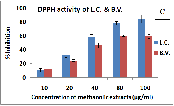 Fig. 1: (A) DPPH scavenging activity of Trolox used as standard. (B) DPPH scavenging activity from methanolic extract of V. negundo (V. N.). (C) DPPH scavenging assay from methanolic extracts of L. camara (L. C.) and B. variegata (B. V.). The results are expressed as mean±SD of three replicates