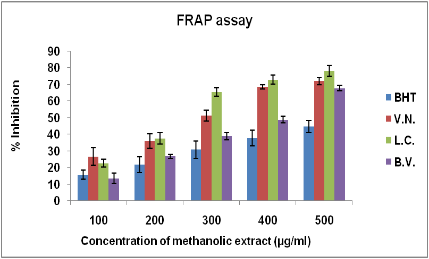 The FRAP antioxidant activity was employed to determine the reducing potential of methanolic extract of selected plants. The IC50 value of the V. negundo, L. camara and B. variegata leaves methanolic extract was mentioned in table 3. BHA was used as a standard. There is a direct relationship between the methanolic concentration of plant extract, BHA and reducing power, where the increase of concentration of plant extract and BHA causes an increase in the reducing capacity (fig. 3).