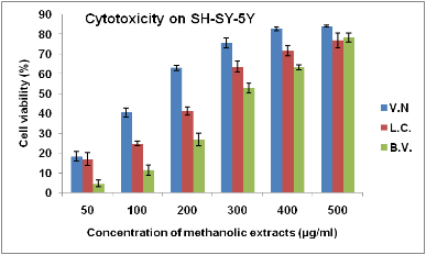 Fig. 4: Cytotoxicity activity from methanolic extracts of the V. negundo (V. N.), L. camara (L. C.) and B. variegata (B. V.) against SH-SY-5Y cells. Cells were incubated for 24 h with various concentrations of methanolic extracts of selected plants. Cell proliferation was examined using MTT assay. All experiments performed in triplicate