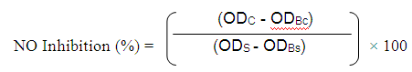 Inhibitory effect on NO production by murine macrophage like RAW264.7 cell was evaluated using a method by Banskota [17]. Briefly, the cell lines were cultured in RPMI-1640 medium supplemented with 10% FBS, 100 units/ml penicillin and 100 μg/ml streptomycin (completed medium). The cell were harvested with trypsin-EDTA and diluted to suspension in a fresh medium. The cells were seed in 96 -well plate with 1x106 cells/well and allowed to adhere for 2 h at 37o C in humidified chamber with 5% CO2. After that, the medium was replaced with a fresh medium containing 100 ng/ml of LPS, together with the test samples at various concentrations and was then incubated for 24 h. NO production was determined by measuring the accumulation of nitrite in the culture supernatant using the Griess reagent. The cytotoxic activity was determined using the 3-(4, 5-dimethylthiazol-2-yl)-2, 5- diphenyltetrazolium bromide (MTT) colorimetric method. Briefly, after 24 h of incubation with the test samples, MTT solution (5mg/ml in PBS) was added to the well. After 2 h of incubation, the medium was removed, and DMSO was added to dissolve the formazan crystal and measured with microplate reader at 570 nm. The test compounds were considered to be cytotoxic when the optical density of the sample-treated group was less than 80% of that in the control (vehicle-treated) group. L-NA was used as positive control. The inhibition (%) of the test sample was calculated by the following equation and 50% inhibitory concentration, IC50 values were determined graphically: