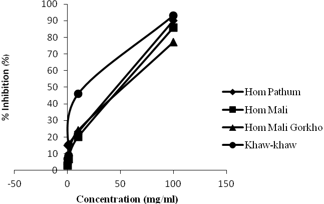 Various mechanisms, such as free radical-scavenging and reducing ability power, have been studied to explain how rice bran extracts could be used as effective antioxidants. The DPPH free radical method has been used extensively to evaluate reducing substances, based on the reduction of ethanol DPPH. solution in presence of proton-donating substance, resulting in the formation of diamagnetic molecules [23]. The scavenging effects of all extracts on DPPH radicals increased with increasing of concentration (Table 2) and DPPH.radical scavenging at IC50 values of rice bran extract is shown in Table 2. With consider to IC50 values of DPPH- scavenging activity, the highest DPPH. radical scavenging of rice bran extracts was found in Hom Mali Gorkho (0.08 mg/ml) and lowest activity was in Khaw-Khaw (0.88 mg/ml).
