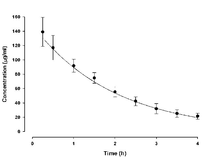 Fig. 2: Mean plasma concentration-time curve obtained after p. o. administration of 316.2 mg/kg of paracetamol to arthritic rats, (mean±SEM, n=6)