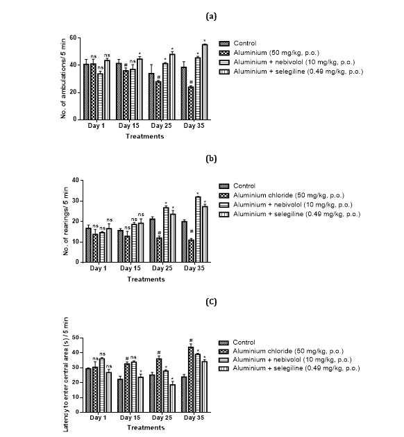 Significant (P<0.05) reduction in number of ambulations and rearings was observed in aluminium chloride treated group as compared to control group on days 15th, 25th and 35th. Also, latency to reach the central area in the open field was significantly (P<0.05) increased as compared to control group. Administration of nebivolol (10 mg/kg) showed significant (P<0.05) increase in both number of ambulations and rearings on 25th and 35th day.