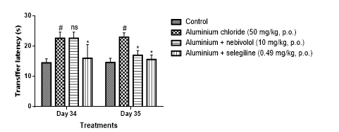 In mEPM test, the animals treated with aluminium chloride exhibited significant (P<0.05) increase in transfer latency compared to control group. Treatment with nebivolol for 5 weeks significantly (P<0.05) reduced transfer latency on both days 34th and 35th as compared to aluminium treated group. Selegiline also significantly (P<0.05) decreased transfer latency as compared to aluminium chloride treated group (Fig. 2).