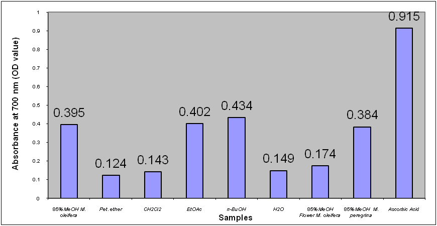 In the current study, the in vitro antioxidant activity of different solvent extracts M. oleifera was evaluated via three antioxidant assays. The reducing power antioxidant activity (expressed in optical density; OD values) were in the order of [n-BuOH (0.434) ˃ EtOAc (0.402) ˃ 85% MeOH (0.395) ˃ H2O (0.149) ˃ CH2Cl2 (0.143) ˃ pet. ether (0.124)], compared to ascorbic acid as a positive control (0.915), 85% MeOH of M. oleifera flowers and 85% MeOH of M. peregrina leaves with OD values of 0.915, 0.174 and 0.384, respectively (fig. 1). The literature survey denoted that the RPAA of 100% MeOH and water extracts of M. oleifera leaves were 271.12 and 134.30 mg equivalent to ascorbic acid/g dry extract [27]. Moreover, the RPAA depends on ability of the tested samples in the reduction of the Fe3+/ferricyanide complex to Fe2+/ferricyanide complex, which can be examined by reading the absorbance (OD value) at 700 nm [18].
