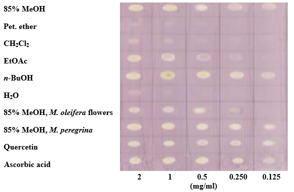The current assay depends on the ability of the antioxidant compounds to act as strong free radical scavengers in a visible model. During the reaction the strong antioxidant agent able to mask the 2, 2'-diphenyl-1-picrylhydrazyl radical (DPPH) displayed by a purple background, then followed by a formation of a wide white zone. The big zone diameter and brightness is a good indicator for the strong antioxidant activity and the tested sample in such case acts as a good free radical scavenger [34]. Accordingly, as shown in (fig. 2) the n-BuOH, 85% MeOH and EtOAc extracts of M. oleifera leaves are good free radical scavengers compared to two well-known standards quercetin and ascorbic acid. Moreover, the 85% MeOH of M. oleifera flowers and 85% MeOH of M. peregrina leaves are considered promising free radical scavengers. The obtained results are in full agreement with the previous studies were done on other plant species [18, 34-37].