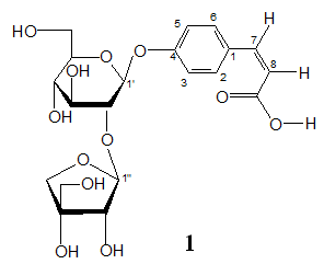 Compound 1 was obtained as pale brown powder, m. p. 233 °C, Rf; 0.86 (S2). It showed yellow colour under UV light. 1H-NMR spectral data (500 MHz, DMSO-d6) revealed to the presence of four aromatic signals characteristic for cinnamoeyl moiety at δ 7.32 (2H, brd, H-2, H-6) and 7.12 (2H, brd, H-3, H-5), two methine protons at δ 6.91 (1H, brd, H-7), 5.32 (1H, d, J=14.35 Hz, H-8), two anomeric protons for glucosyl moiety at δ 4.49 (1H, brs, H-1') and apiofuranosyl moiety at δ 4.91 (1H, brd, H-1''), finally 3.2-3.55 (m, remaining sugars-protons). 13C-NMR spectral data (125 MHz, DMSO-d6) revealed to the presence of twenty carbon resonances; including six aromatic signals characteristic for cinnamoeyl moiety appeared at δ 130.63 (C-1), 129.86 (C-2), 116.90 (C-3), 155.96 (C-4), 116.90 (C-5), and 129.86 (C-6), two methine carbons at δ 128.69 (C-7), 124.88 (C-8) and 178.02 (C-9). Six carbon signals for glucosyl moiety including anomeric carbon resonance at δ 98.82 (C-1'), 81.53 (C-2'), 82.26 (C-3'), 69.93 (C-4'), 73.24 (C-5'), 61.52 (C-6'). Five carbon signals for apiofuranosyl moiety including anomeric carbon resonance at δ 104.73 (C-1''), 72.03 (C-2''), 81.53 (C-3''), 73.24 (C-4'') and 63.48 (C-5'') (table 5). Furthermore, acid hydrolysis of the compound afforded glucose and apiose sugar in the aqueous phase which was confirmed by Co-thin layer chromatography (Co-TLC) with authentic sugar sample. All protons and carbons resonances were in agreement with the reported data [45], therefore, compound 1 was identified as cis-p-coumaric acid 4-O-(2'-O-β-D-apiofuranosyl)-β-D-glucopyranoside.