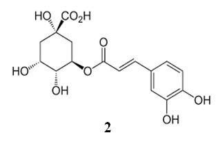 Compound 2 was obtained as a white powder, m. p. 200-202 °C, Rf; 0.77 (S2). It gave effervescence with sodium bicarbonate indicating its acidic nature; also it showed deep blue spot upon paper chromatography under long UV wavelength. Based on the Co-PC with the authentic sample, compound 2 was identified as chlorogenic acid [46].