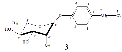 Compound 3 was isolated as pale yellow fine crystals, m. p.170-172 °C, Rf; 0.40 (S2). It showed a characteristic spot with fluorescent violet colour under UV light. 1H-NMR spectral data (500 MHz, DMSO-d6) revealed to the presence of a set of protons including two resonances in the aromatic region (AB system); at δ 7.02 ppm (2H, d, J=7.65 Hz, H-2,6), 7.24 ppm (2H, d, J=7.65 Hz, H-3,5), and one characteristic signal for benzylic methylene group at 3.91 ppm (2H, s, H-7), anomeric proton at δ 5.33 ppm (1H, brs, H-1'), signal for methyl group of sugar moitey at 1.05 ppm (3H, d, J=5.75 Hz, CH3-Rha), and 3.58-4.76 ppm (4H, H-2',3',4',5'; rest of sugar protons). 13C-NMR spectral data (125 MHz, DMSO-d6) revealed to the presence of twelve carbon resonances were assigned to six aromatic carbons at δ 155.99 (C-1), 117.43 (C-2,6), 129.86 (C-3,5), 131.0 (C-4), and one methylen carbon at δ 22.12 (C-7), characteristic carbon signal for nitril moiety at δ 124.91 (C-8), anomeric carbon for the rahmonosyl moiety at δ 98.90 (C-1'), the remaining carbons of sugar moieties were appeared at δ 70.68 (C-2'), 70.04 (C-3'), 70.96 (C-4'), 65.80 (C-5'), and the most upfield methyl carbon at δ 18.41 ppm (C-6', CH3-Rha) (table 5). Otherwise, the complete acid hydrolysis of the compound revealed L-rhamnose in the aqueous phase which was detected by Co-thin layer chromatography (Co-TLC) with authentic sugar. All protons and carbons shifts were in full agreement with the literature [47, 48], therefore, compound 3 was identified as 4-[(α-L-rhamnosyloxy) benzyl] nitrile (niazirin).