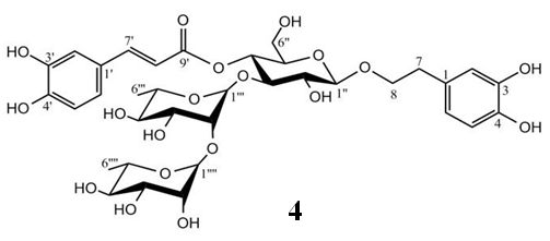 Compound 4 was obtained as pale brown fine crystals, m. p. 287 °C, Rf; 0.76 (S2). It showed a blue colour under long UV wave length. 1H-NMR spectral data (500 MHz, DMSO-d6) revealed the presence of three aromatic protons resonances corresponding to cinnamoeyl moiety [(E)-caffeoyl moiety] at δ 7.73 (1H, brs, H-2'), 7.12 (1H, brd, H-5'), 7.20 (1H, brd, H-6'), two protons at δ 7.87 (1H, d, J =15.5 Hz, H-7') and 6.27 (1H, d, J=15.5 Hz, H-8'), another set of three aromatic protons at δ 6.91 (1H, brs, H-2), 6.65 (1H, brd, H-5), and 6.51 (1H, brd, H-6), the appearance of three aliphatic protons at δ 2.79 (2H, t, H-7), 3.89 (1H, m, H-8a), 4.03 (1H, m, H-8b) is characteristic for the presence of 3,4-dihydroxy phenylethanoid moiety. In, addition, three characteristic signals for three anomeric protons at δ 4.54 (1H, brs, H-1''), 5.61 (1H, d, J=7.65, Hz, H-1'''), and 5.28 (1H, brs, H-1''''). The remaining sugars protons appeared at δ 3.50-3.79 ppm, two methyl protons at δ 0.82 (3H, d, J=5.75, Hz, Rha-6'''), and 1.26 (3H, brd, Rha-6''''). Moreover, the complete acid hydrolysis of the compound afforded D-glucose and L-rhamnose in the aqueous phase which was detected by Co-thin layer chromatography (Co-TLC) with authentic sugar markers. All protons resonances were in agreement with the reported data [49], therefore, compound 4 was identified as 3,4-dihydroxy-β-phenylethoxy-O-α-L-rhamnopyranosyl -(l→2)-α-L-rhamnopyranosyl-(1→3)-4-O-caffeoyl-β-D-glucopyranoside (phlinoside C).