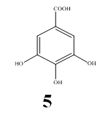 Compound 5 was obtained as a white powder; m. p. 250-252 °C, Rf; 0.75 (S1) and 0.55 (S2). It gave a dark violet spot under long UV wavelength; also it showed effervescence with sodium bicarbonate indicating its acidic nature [46]. According to the Co-PC with the authentic sample, compound 5 was identified as gallic acid.
