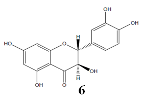 Compound 6 was obtained as a dark yellow powder; m. p. 232-234 °C, Rf; 0.03 (S2). It gave a dark yellow spot under long UV light not affected with AlCl3. Based on the Co-PC with the authentic sample, compound 6 was identified as taxifolin [46].