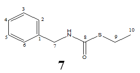 Compound 7 was isolated as pale brown fine needles, m. p. 60-62 °C, Rf; 0.82 (S2). It showed a blue color under long UV light. 1H-NMR spectral data (500 MHz, DMSO-d6) revealed the presence of five aromatic signals characteristic for mono-substituted phenyl ring at δ 7.48 (1H, m, H-2), 7.67 (1H, m, H-3), 7.48 (1H, m, H-4), 7.67 (1H, m, H-5), and 7.48 (1H, m, H-6). Two methylene groups appeared at δ 4.09 (2H, brd, H-7), and 3.13 (2H, brd, H-9), and characteristic signal for amino proton at δ 5.66 (1H, brs, N-H). All protons resonances were in agreement with the reported data [50], therefore, compound 7 was identified as benzyl-carbamothioethionate.