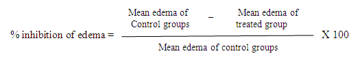 Sprague Dawley rats weighed between 250-300gm and fasted for 24hours before the test. The animals were divided into five groups with six animals in each group. The volume of the right hind paw was measured using plethysmometer. This constituted the initial reading. Compounds were tested in dose of 100mg/kg body weight. Indomethacin (5mg/kg) was used as standard. The compounds were administered as suspension in sodium CMC (0.1%W/V) intraperitoneally one hour before the injection of carrageenan. Control group of animals received a suspension of sodium CMC only. 0.1ml of 1.0%W/V carrageenan suspension in normal saline was injected into the plantar region of the right hind paw. The inflammation produced after injection of the phlogistic agent was measured at two hours intervals for 8hrs.