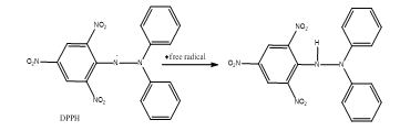 A simple method that has been developed to determine the antioxidant activity of the drug utilizes the stable 2,2- diphenyl-1-picrylhydrazyl(DPPH) radical. The odd electron in the DPPH free radical gives a strong absorption maximum at 517nm and is purple in colour. The colour turns from purple to yellow as the molar absorptivity of the DPPH radical at 517nm reduces from 9660 to 1640 when the odd electron of DPPH radical becomes paired with hydrogen from a free radical scavenging antioxidant to form the reduced DPPH+H+. The resulting decolourisation is stoichiometric with respect to the number of electrons captured. Antioxidant compounds may be water soluble, lipid soluble, insoluble or bound to cell walls. Hence extraction efficiency is an important factor in quantification of antioxidant activity of foods. Ascorbic acid (as the reference standard) and the sample are reacted with DPPH solution in methanol/water for 30mins at 350C in a test tube and the absorbance changes are measured at 517nm.