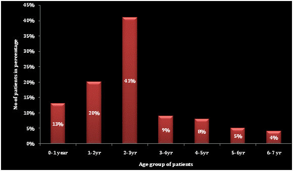 The total one hundred fifty seven patients were included in the present study, in which 80% were OPD and 20% were IPD Patients. All cases sent to Laboratory for the Antibiotic sensitivity testing, 50 case showed positive blood culture. Maximum patients were in age group of 2-3yr (41%), 65% of patients were female children. Fig 1